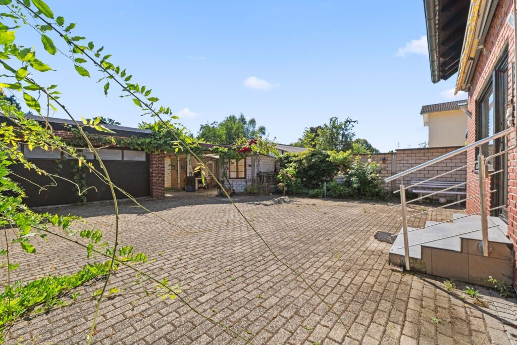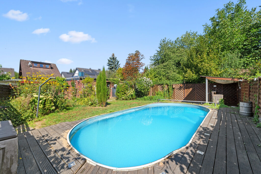 Das 624 m² große Grundstück ist ein wahres Paradies: Der gepflegte Garten verfügt über mehrere Abstellräume, einen einladenden Freisitz und einen beheizbaren Pool. Die Privatsphäre ist durch die uneinsehbare Lage und das elektrisch bedienbare Einfahrtstor garantiert.