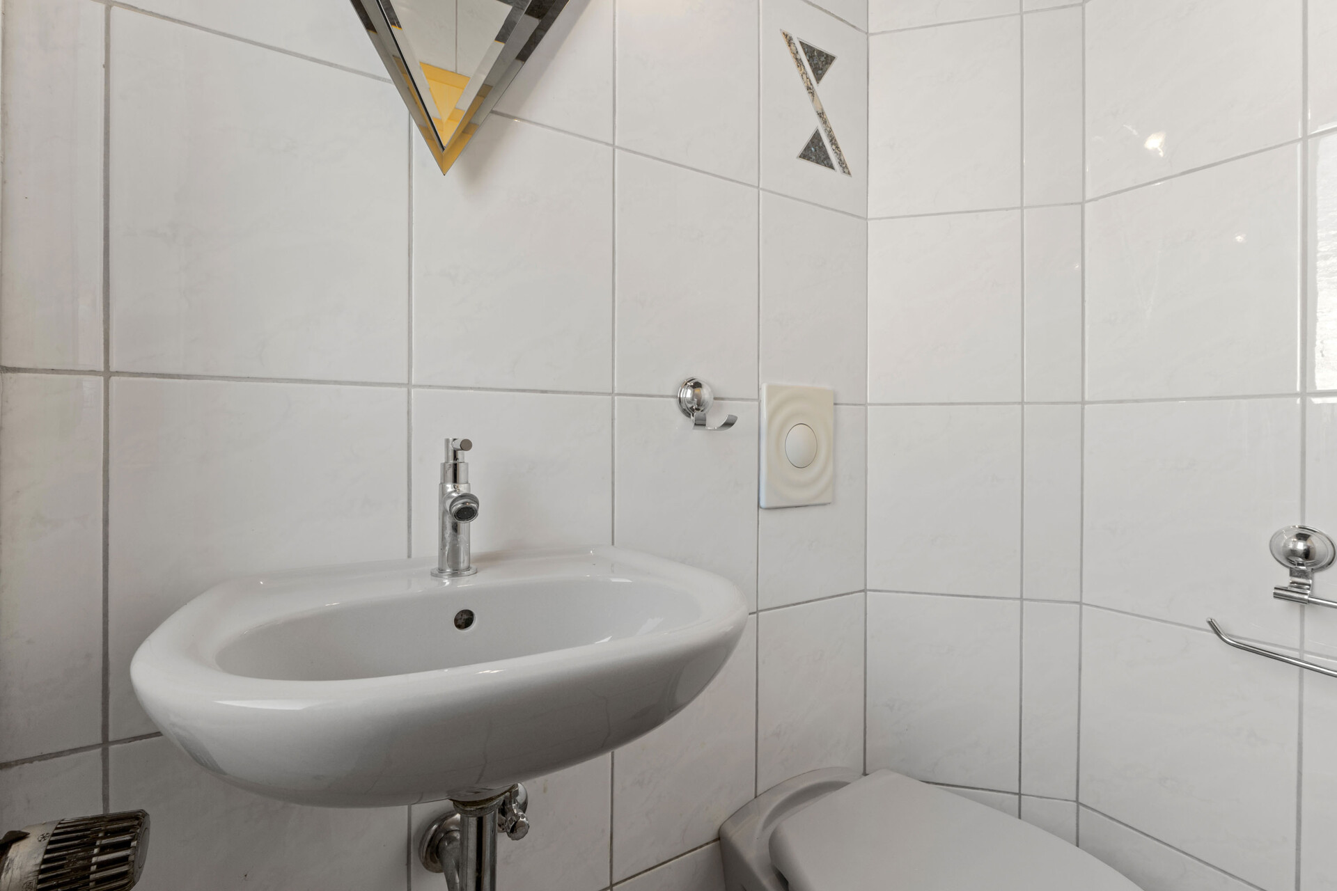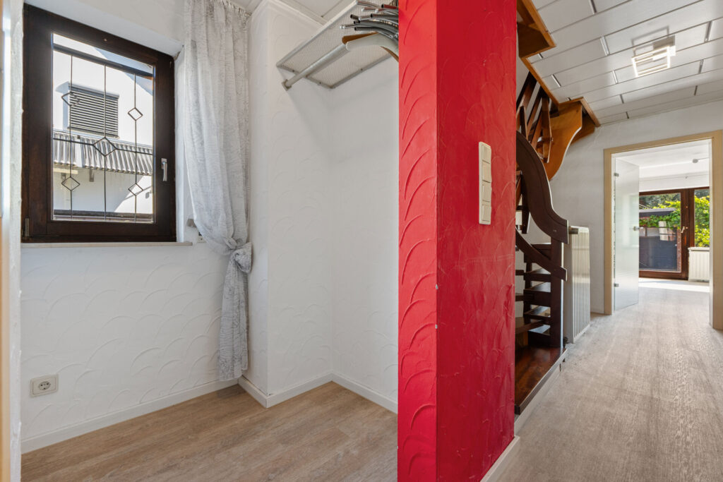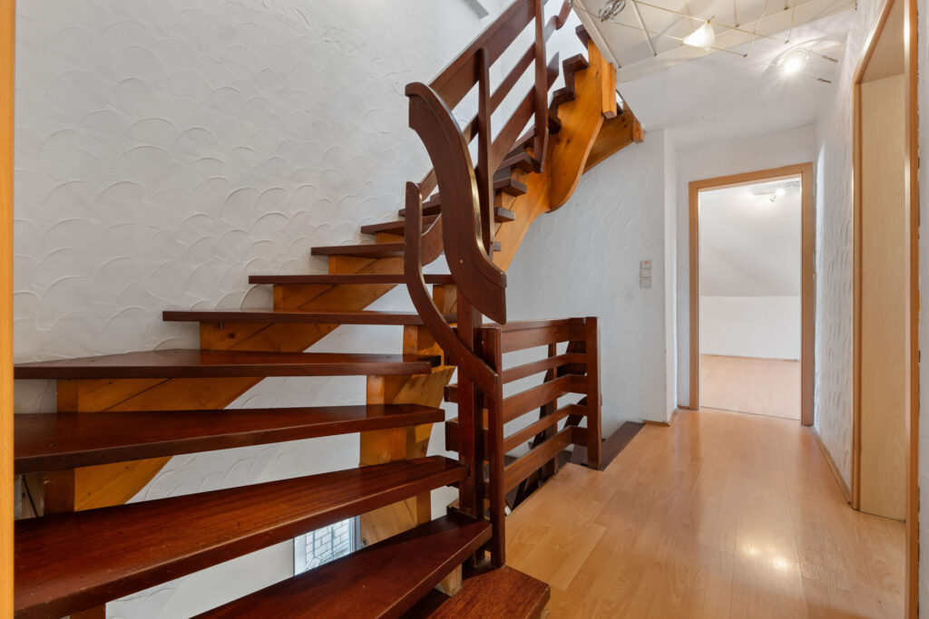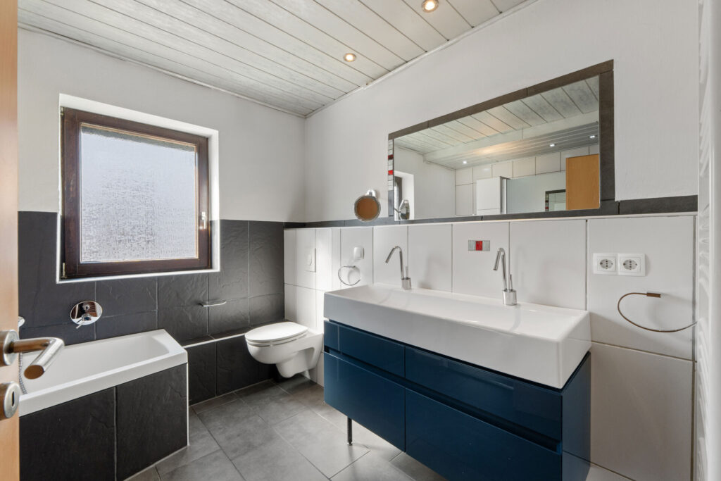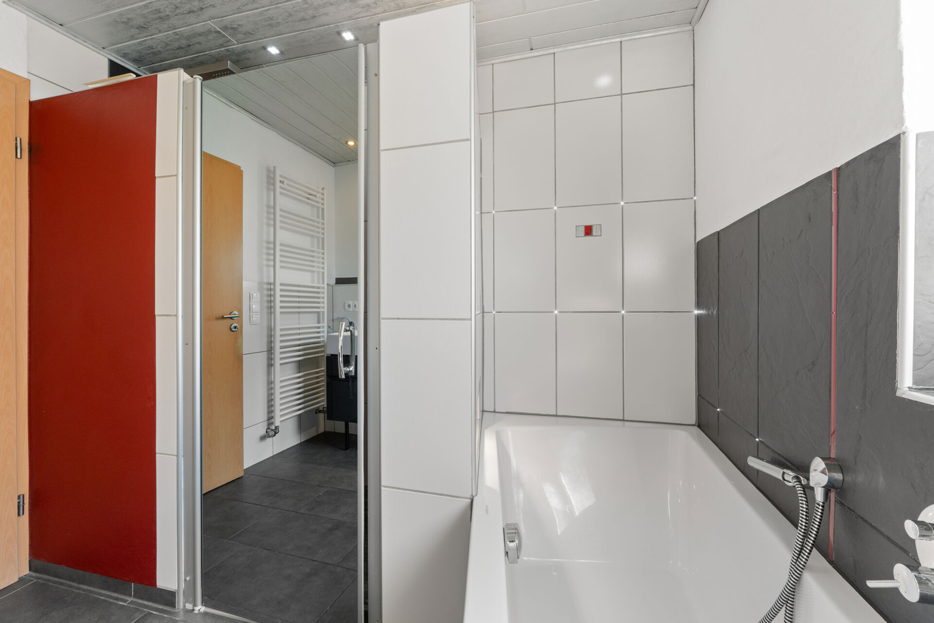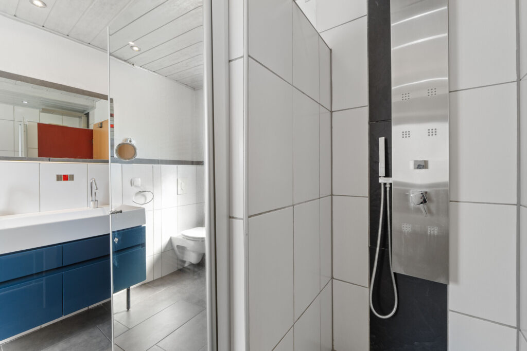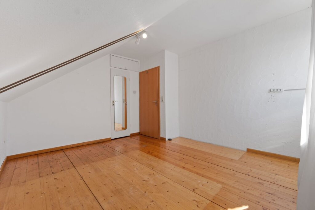 Im Obergeschoss erwartet Sie ein komfortables Elternschlafzimmer mit praktischer Ankleide sowie ein vollständig modernisiertes Bad mit bodengleicher Dusche und elegantem, großzügigem Waschbecken. Das großzügige Kinderzimmer kann bei Bedarf in zwei separate Räume geteilt werden – so war es bereits in der ursprünglichen Planung vorgesehen.