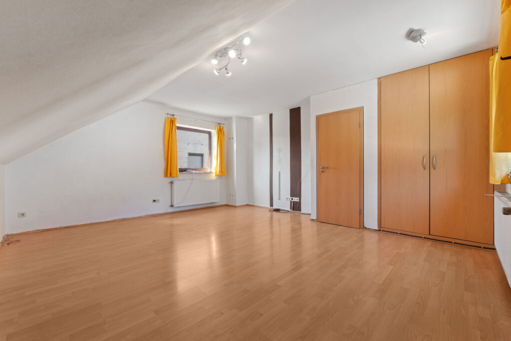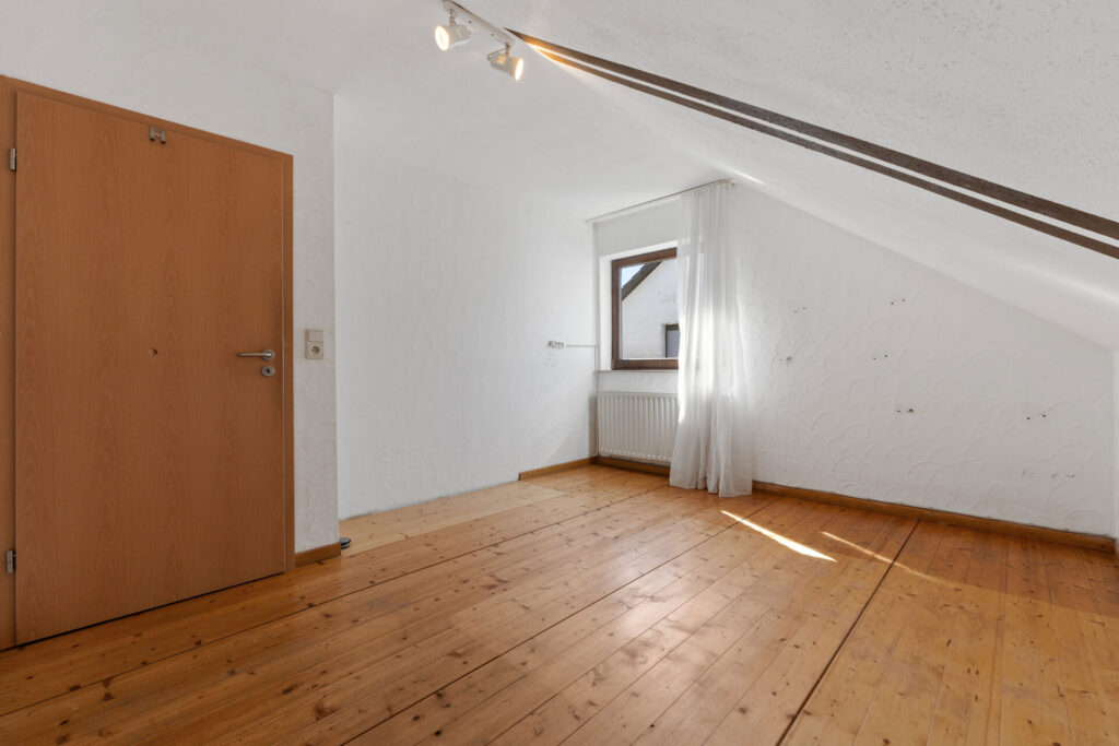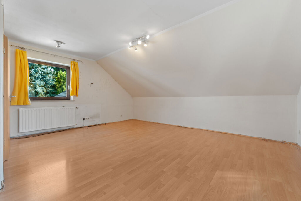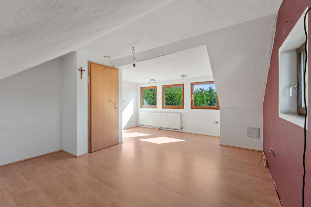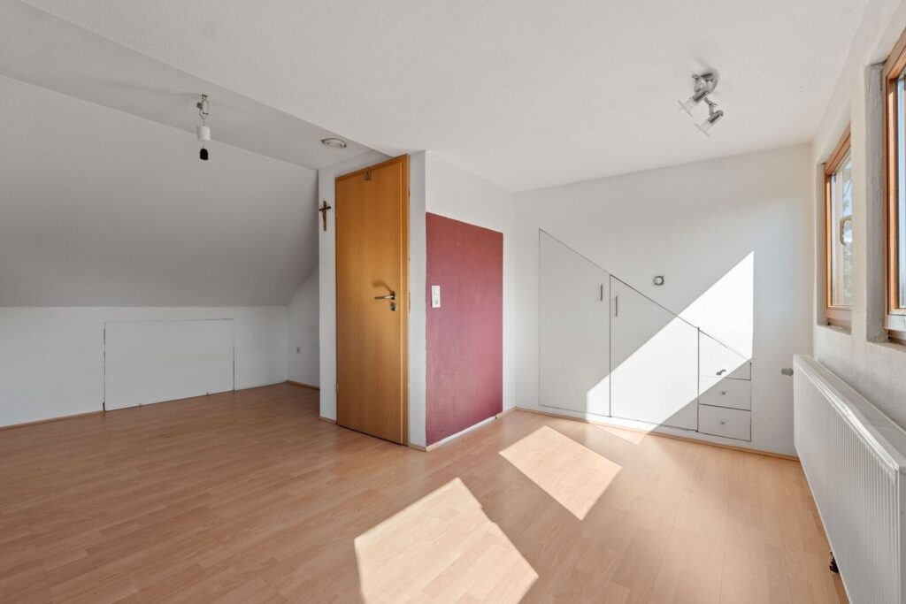 Das ausgebaute Dachgeschoss beherbergt ein helles Studiozimmer mit Gaube und herrlichem Blick in den Garten – ideal als Büro oder Hobbyraum.