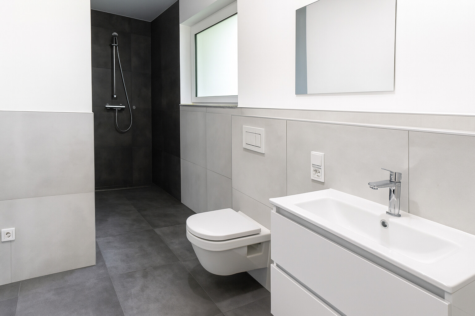 – Bodengleiche Dusche mit Regendusche oder Badewanne (je nach Grundriss)