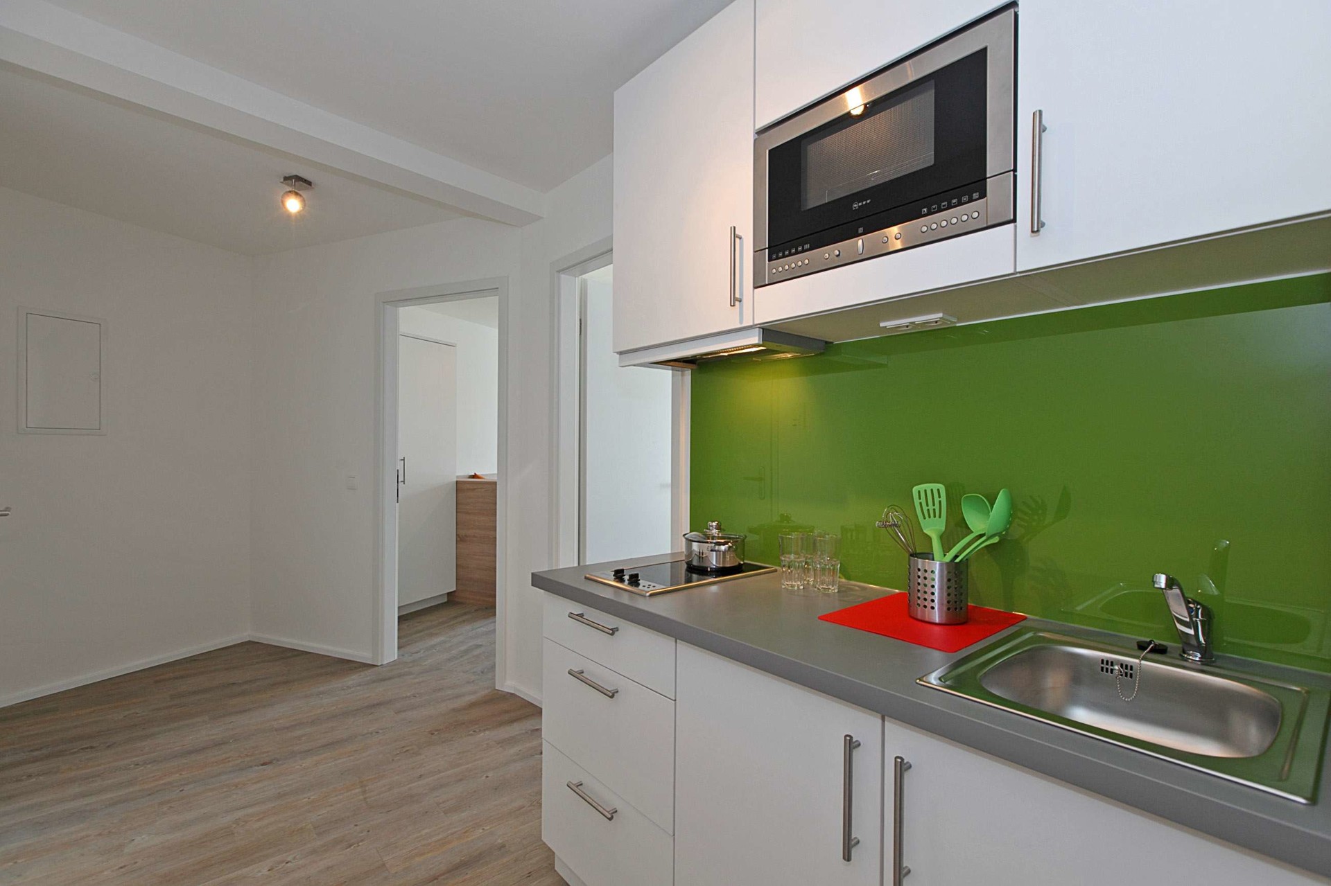 – Vollständige Pantry-Küche mit Ceranfeld, Kühlschrank mit Gefrierfach, Mikrowelle mit Grillfunktion