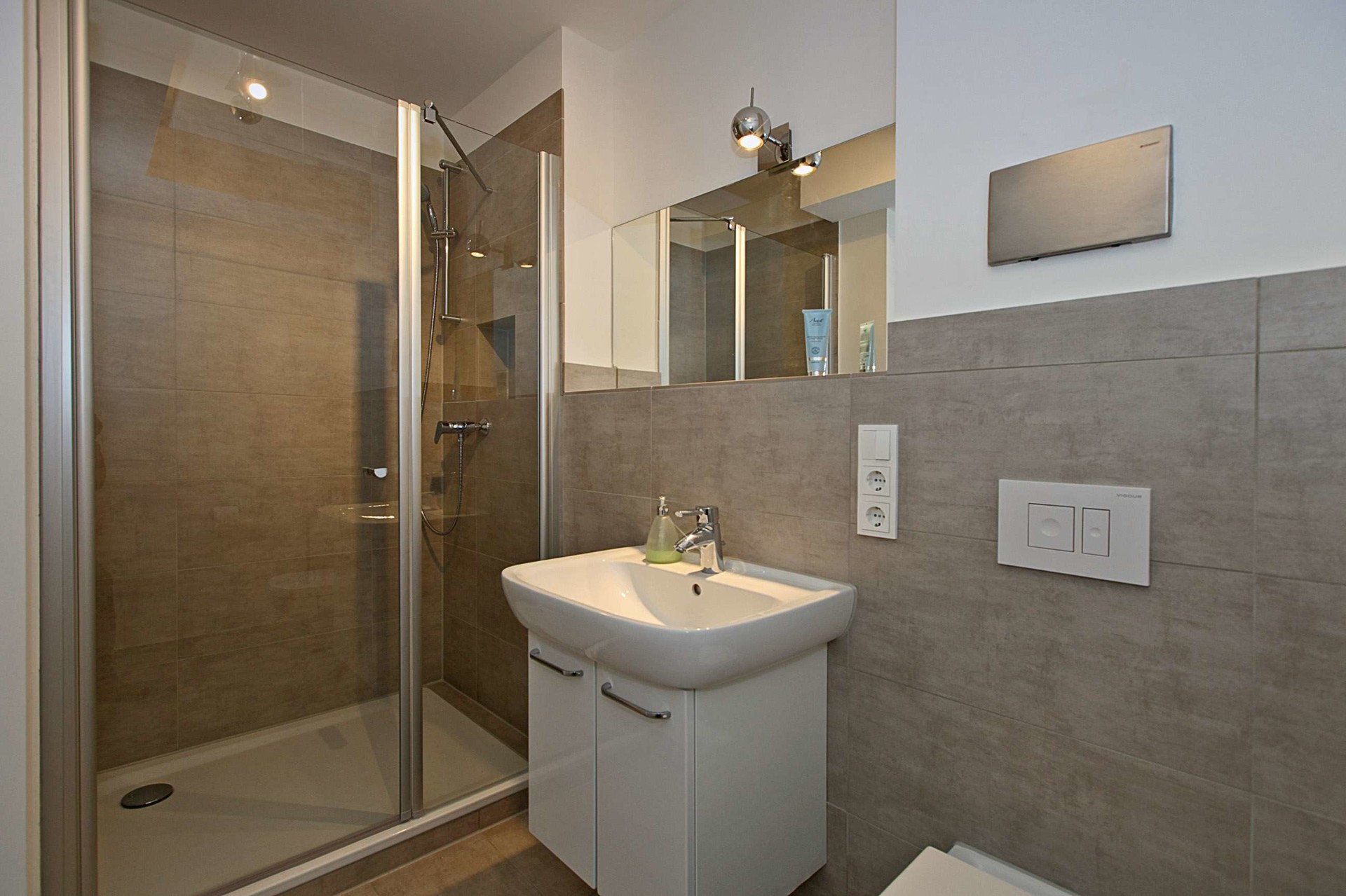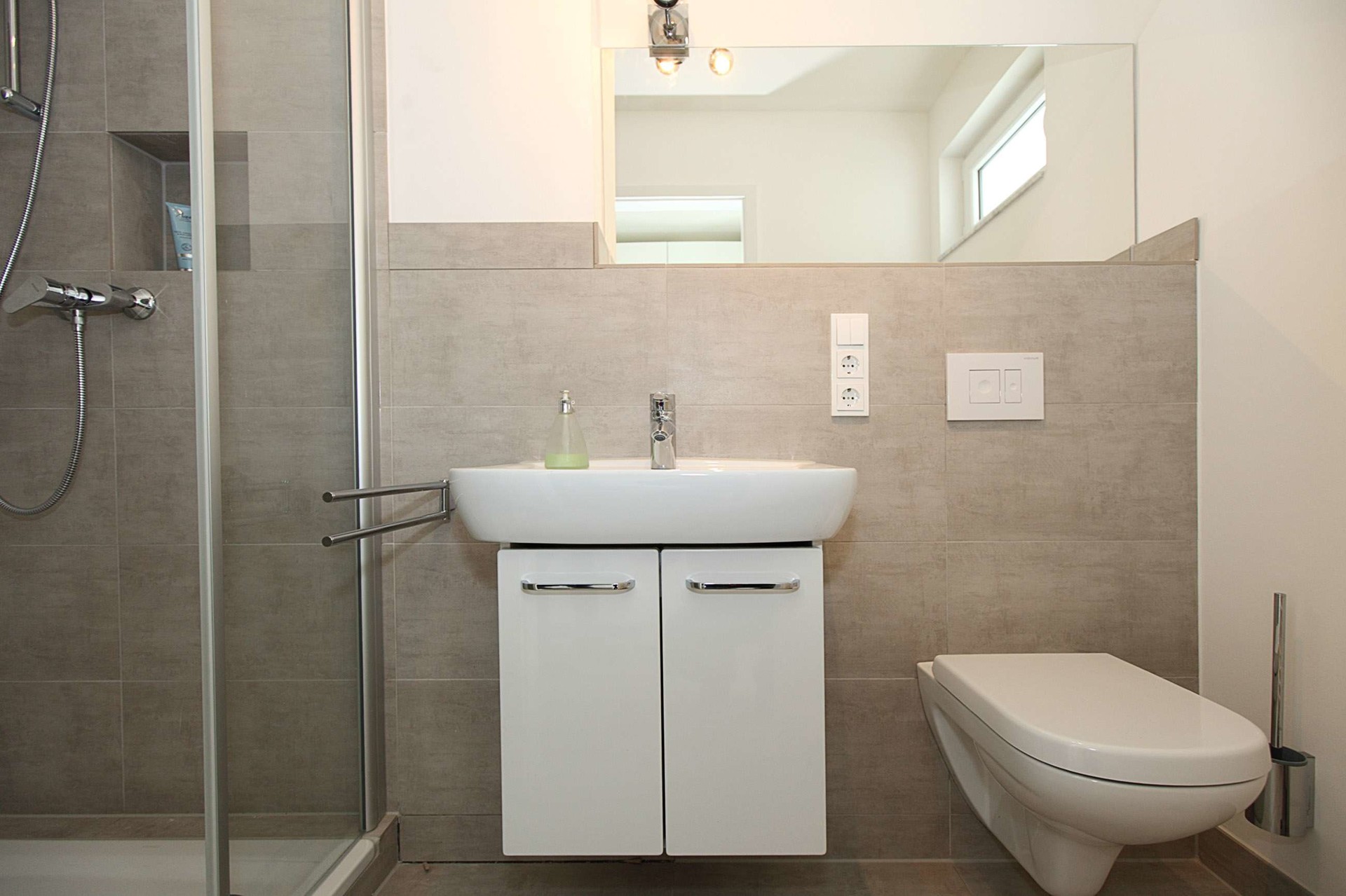 – hochwertig gestaltetes Bad mit Dusche, WC, Waschbecken mit Unterschrank Ablagefläche unter dem Spiegel, Handtuchheizkörper